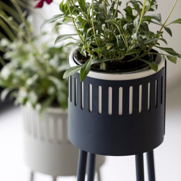 Der Blumenständer ist aus hochwertigem Stahl gefertigt, was ihm eine besonders robuste und langlebige Struktur verleiht. Der Blumentopf selbst besteht aus hochwertiger Keramik, die Eleganz und Funktionalität perfekt kombiniert. Oft wird der Blumenständer durch Materialien wie Holz oder Kork ergänzt, um die natürliche und warme Seite des skandinavischen Designs zu betonen. Das renommierte dänische Designstudio Hans Thyge & Co. hat bei der Gestaltung den typischen nordischen Designansatz verfolgt, der Schlichtheit und Funktionalität in den Vordergrund stellt. Gleichzeitig wird das Design durch dezente Vintage-Elemente abgerundet, die dem Ständer eine besondere Note verleihen.