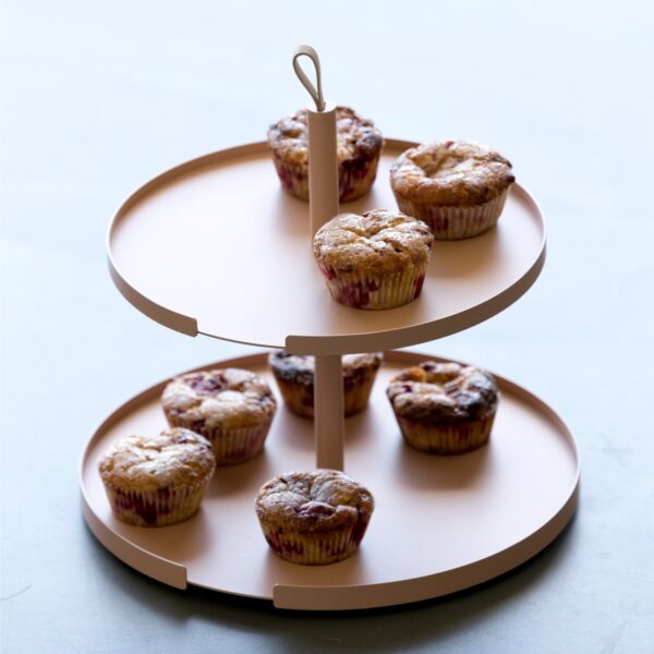 Scandinavian style cake stand by Hans Thyge & Co, two-tier, metal/wood/cork, ideal for elegant presentations