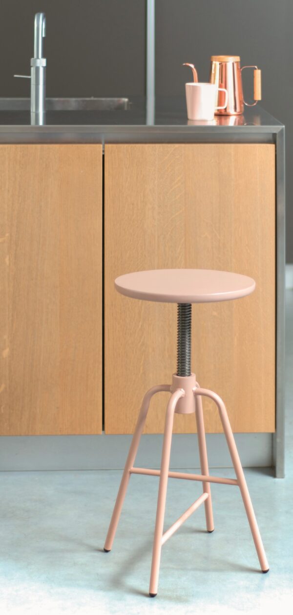 Hocker im skandinavischen Design von Hans Thyge & Co., verstellbare Höhe, aus Metall/Holz/Kork, platzsparend und funktional.
