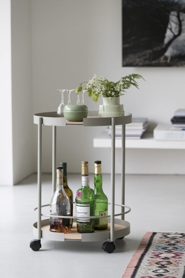 Servierwagen BIG HUG im skandinavischen Design, Ganzmetall-Konstruktion, erhöhte Fachböden, Gummiräder und Korkauflagen.