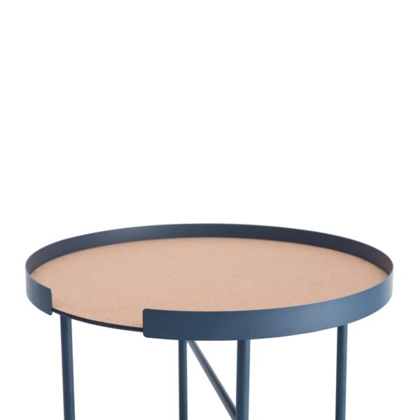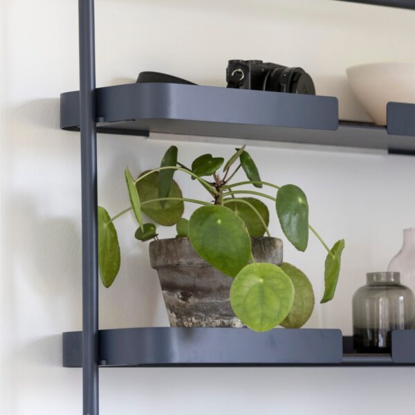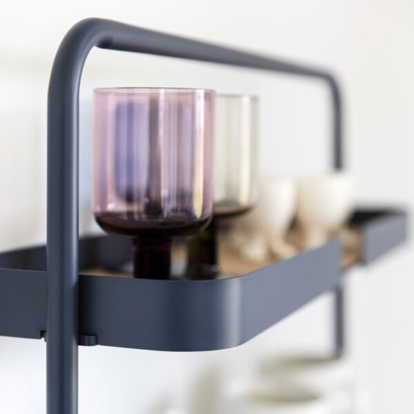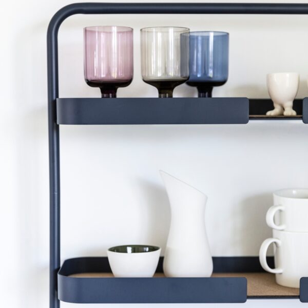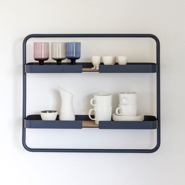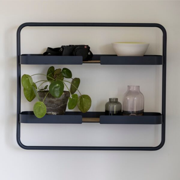 Niedriges Wandregal im skandinavischen Design von Hans Thyge & Co., zwei Ablagen mit Korkpads, verfügbar in Nachtblau und Hellgrau, ideal für vielseitige Nutzung.