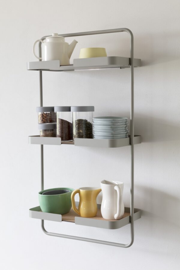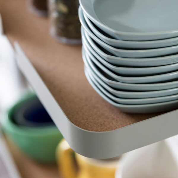 Niedriges Wandregal im skandinavischen Design von Hans Thyge & Co., zwei Ablagen mit Korkpads, verfügbar in Nachtblau und Hellgrau, ideal für vielseitige Nutzung.