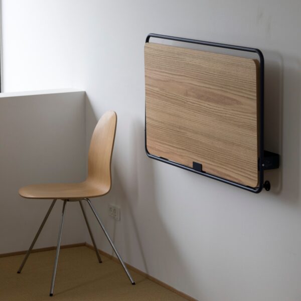 Klappbarer Wandtisch im skandinavischen Design von Hans Thyge & Co., aus Metall und Eichenholz, groß und rechteckig, ideal für moderne Interieurs, platzsparend.