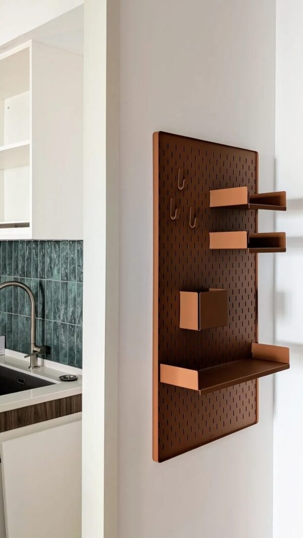 Die Haken sind nicht nur praktisch, sondern auch ästhetisch ansprechend und fügen sich nahtlos in das Design des Schienenregalsystems ein. Ihr robustes Design gewährleistet eine sichere Aufbewahrung verschiedener Gegenstände.